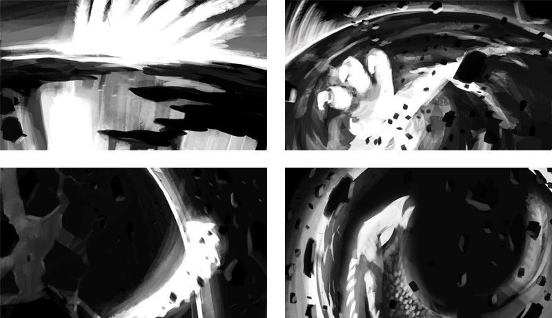 An oil team is preparing for “the historical drilling” – they want to drill deep to extract the last oil reserve from the earth. They hit something inside the earth, something alive. A general devastation begins. The earth shell cracks and a giant creature hatches out of the earth. A young space dragon is born. The planet is dead. The hollowed crust of the earth as pieces of egg shells is fading away. It is moving towards the sun...