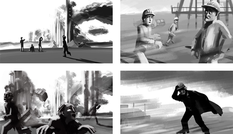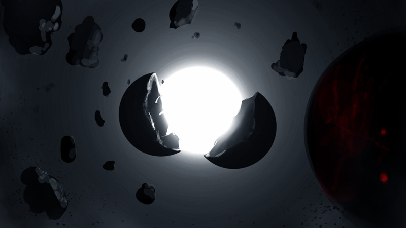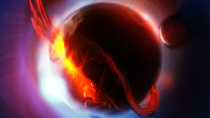 An oil team is preparing for “the historical drilling” – they want to drill deep to extract the last oil reserve from the earth. They hit something inside the earth, something alive. A general devastation begins. The earth shell cracks and a giant creature hatches out of the earth. A young space dragon is born. The planet is dead. The hollowed crust of the earth as pieces of egg shells is fading away. It is moving towards the sun...
